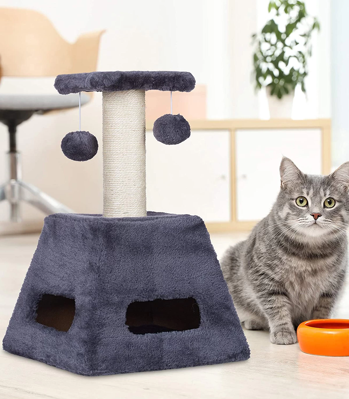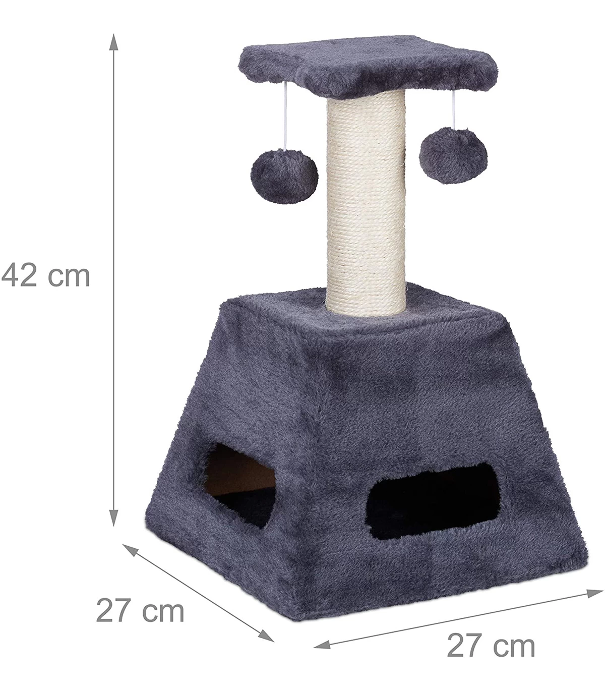 Stalp de zgariat pentru pisici cu trunchi de sisal si jucarii, Turn mic, Gri, 27 x 27 x 42 cm